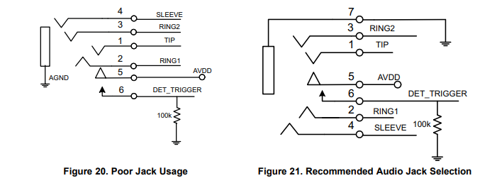 如果TIP或RING1在检测过程中传输音频信号,则无法保证麦克风检测。为确保正确检测,在检测序列完成之前(插入后500毫秒),不要从耳机放大器输出音频。