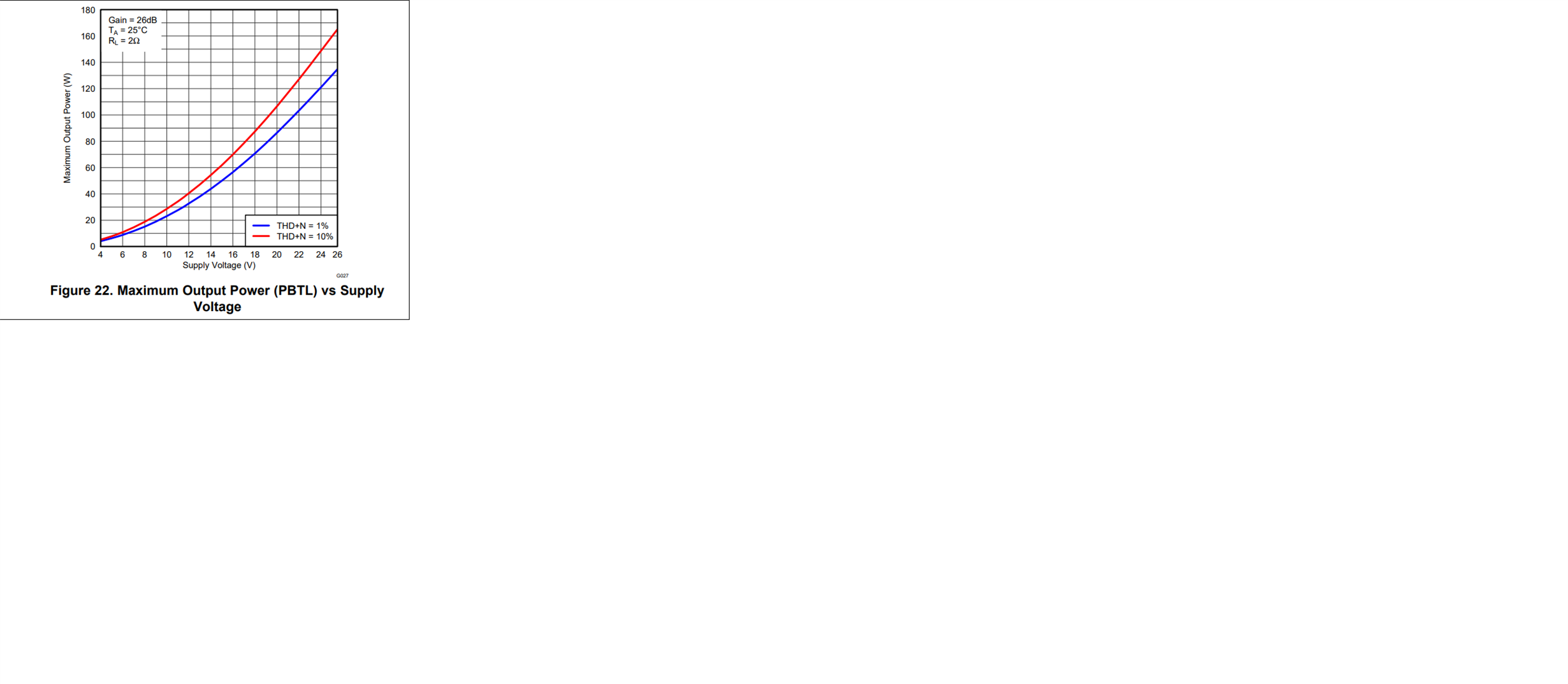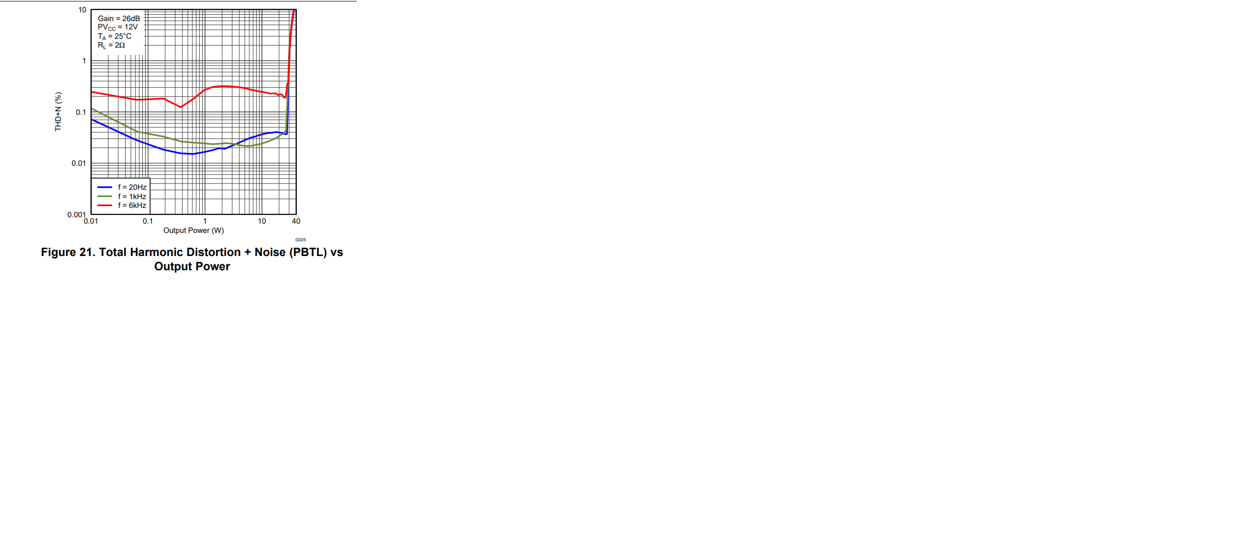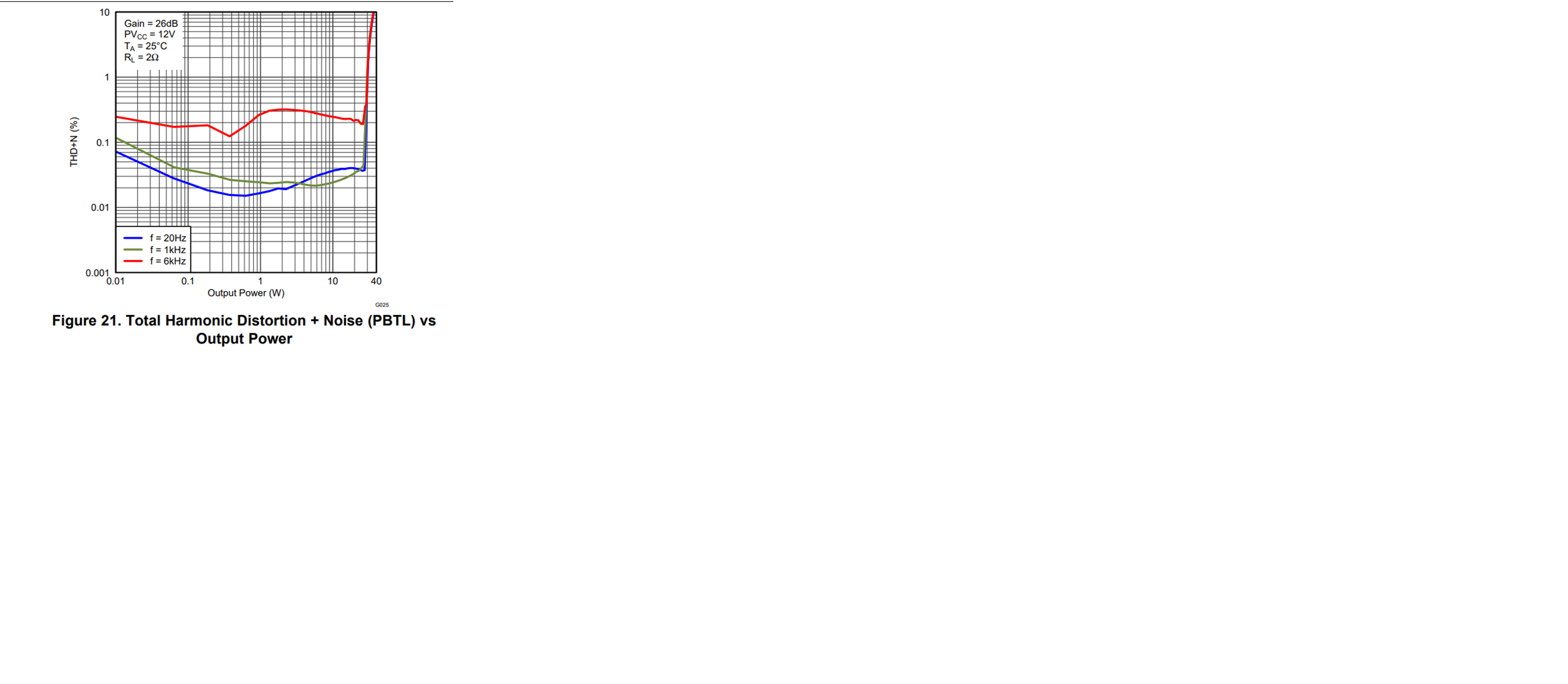 请问一下,TPA3116在使用PBTL模式,阻抗2欧姆,功耗100w时,THD+N和频响能做到多少?