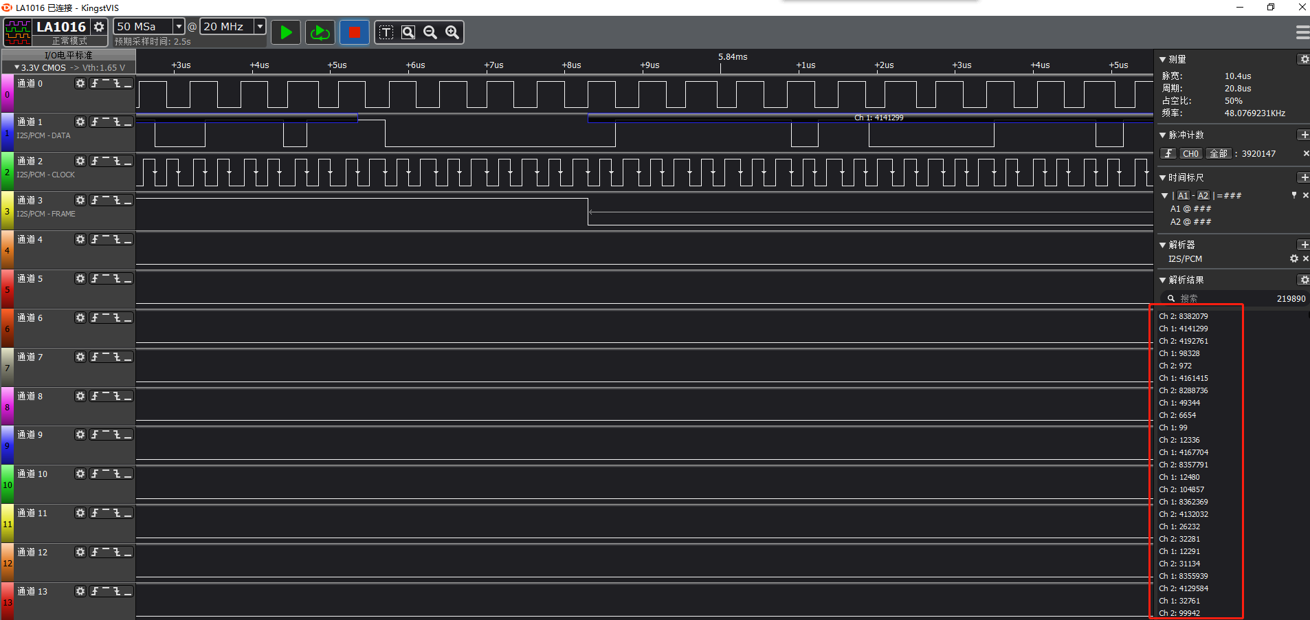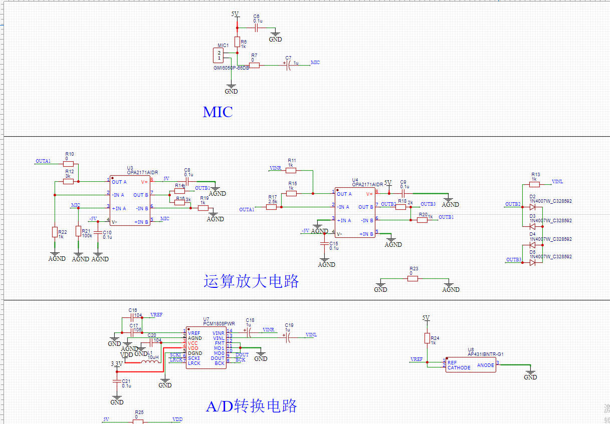 在硬件电路设计的时候PCM1808芯片的电路基本上是按照芯片手册设计的,晶振采用的是18.432MHz,采样频率设置的是48K,从机模式,数据格式是I2S,24-Bit, 放大电路是自己设计的。现在出现了一个问题,从PCMI808获取的数据一直再跳,用(LP = 20log(Prms/pref))这个公式换算出来的音量一直在100分贝到144分贝,偶尔也会有90多分贝、10多分贝。用示波器测试PCM1808左右通道时,有声音的时候波形是用变化的,用万用表测试PCM1808的VCC管脚是5.039V,VREF是2.457V,左右声道的电压都是2.455V。请帮我分析一下问题的原因,谢谢。原理图如下: