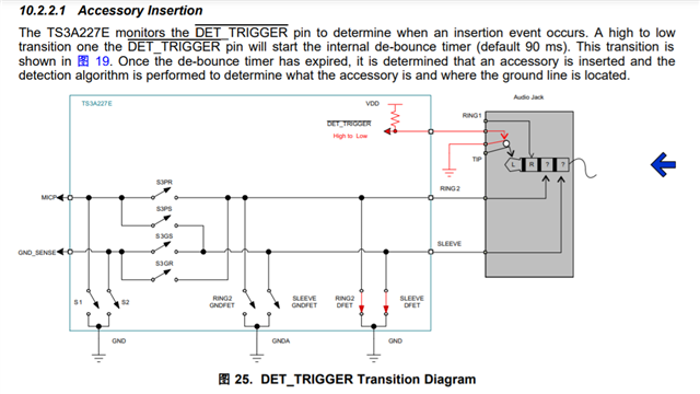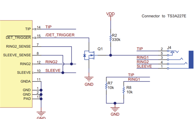关于TS3A227E部分原理图需要帮忙确认,我们是使用下面这种耳机规格,请帮忙确认一下DET_TRIGGER这部分电路图该怎么搭建,HP_HPD该怎样检测,谢谢!