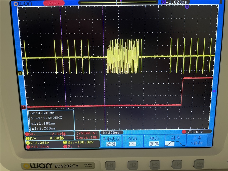 第一幅片中蓝色波形第一级输出是正常的吗?手机干扰造成的输出错误是指的第二幅 图片中黄色波形中间部分吗?如果是这样的话,那可能是手机干扰耦合到了第二级电路中或第二级输出中