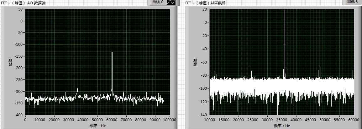 采集部分我用的是PCM4220,AO的输出直接接示波器,看到的波形频率与AI采集的频率一致,但是波形上面有很多毛刺,如果输出的波形频率小于40kHz,采集到的和输出的在频谱上看是可以对的上的,应该不是压摆率的问题,因为我将幅值调的很小,情况也没有变化,只是示波器上的波形毛刺更大了