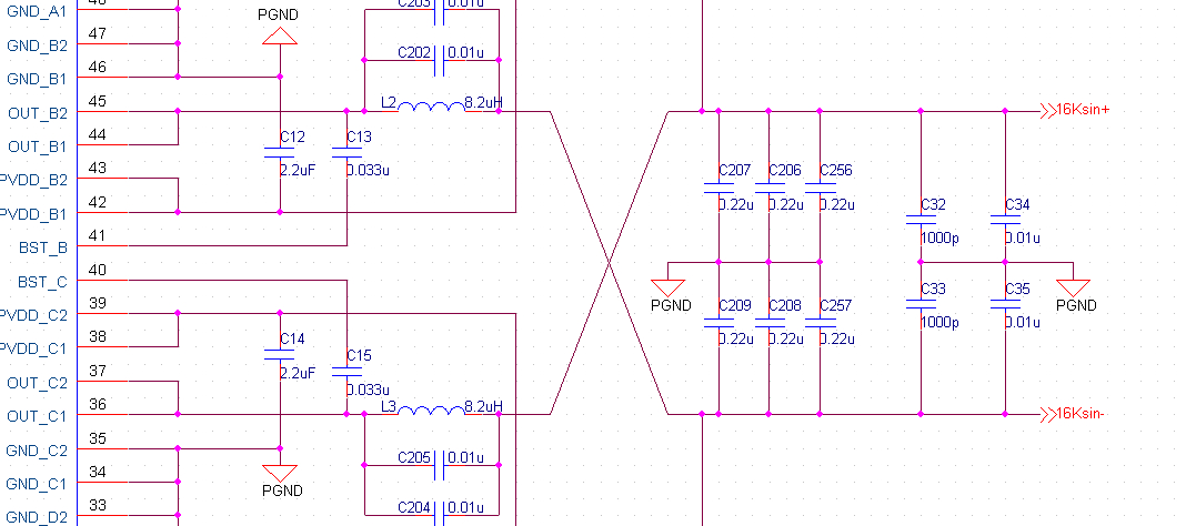 OSC-IO+ OSC-IO- 这两个引脚既可以作为输入引脚,也可以作为输出引脚,当TAS5613为maser时,为输出引脚,为slave时,为输入引脚外部可连接晶振,不知你的应用是什么,另外,音频云中选择音频放大器的优点在于效率高,最佳的噪声性能,DRC功能等都优于普通的运放。