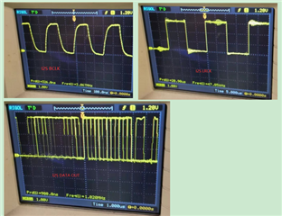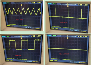 2)PCM3168工作在TDM I2S从模式下,就有问题了,DATA OUT脚没信号输出,都是低电平,硬件是跟第一步I2S的硬件完全一样,只是配置变成了TDM I2S模式,对应寄存器的变化是0x51和0x41寄存器都从0变成了6,其他没变。