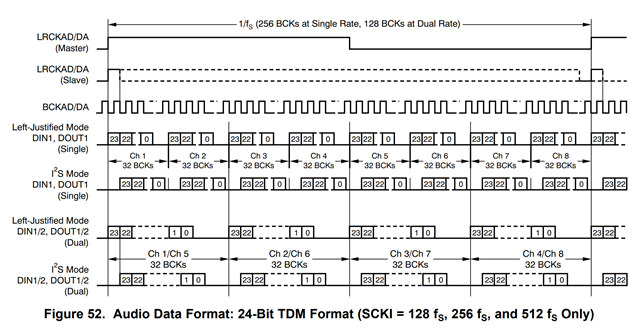 您好,上面的log信息是针对I2S的是吗?建议将您将能正常工作的I2C和不能正常工作的I2C寄存器配置信息附上。另外,TDM格式的时序是否满足Figure 52的要求: