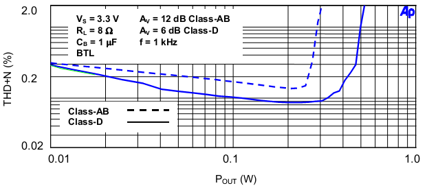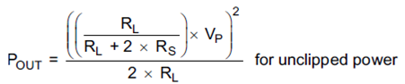 RL为喇叭阻抗,RS为MOSFET导通电阻RDSON,VP为电源电压。功率对THD+N的影响见问题3。