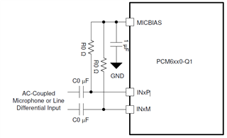 是的,您的理解是对的,因为AC耦合电容将偏置电压隔离掉了,需要重新建立新的偏置电压,目的为了保证输入满足PCM6360的输入电压范围,所以将MICBIAS接到输入端。