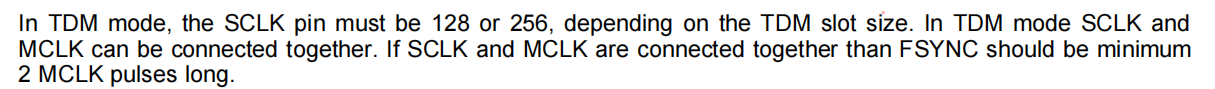 根据TAS6424的规格书,在TDM模式下,MCLK和SCLK两个信号引脚连接到一起,且FSYNC的宽度必须最小为两个MCLK的周期。但由于设计需要,我们将TAS6424与其他D类功放(deviceB)接到同一个TDM接口下,