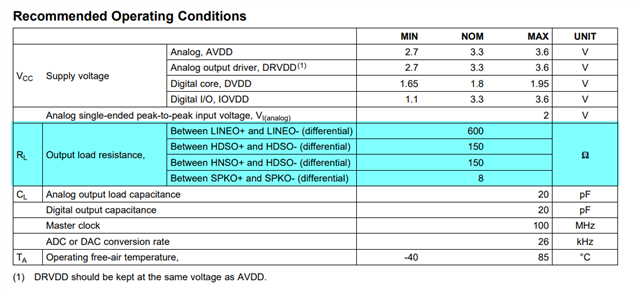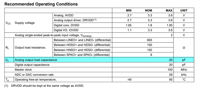 TLV320AIC20各输出接口驱动能力如下datasheet 截图: