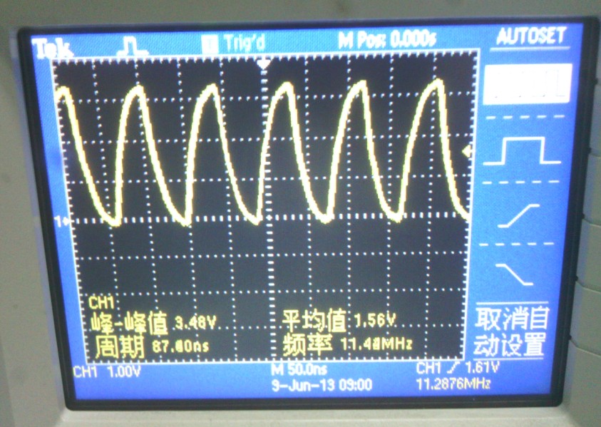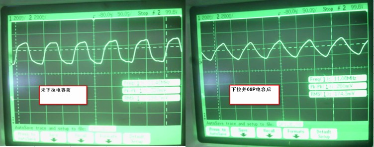 我将L/R的IC MCLK电阻断开后,SW无输出,读错误码要等软件工程师回来,MCLK是从MCU LM3S5651的16M晶振而来,用探笔探MCLK线输出就正常了,感觉是这根线的问题,觉得是探笔改变了其容值,我之前改为了33P有改善,但还有不良,再加大的话就不知道后续还会不会再出此问题,下图为没电容前与加了下拉68P后的波形.