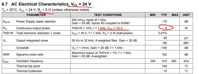 4、TPA3113D2最大输出功率多少,即24V供电时候。
