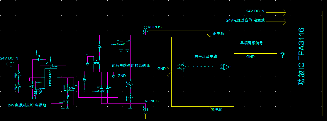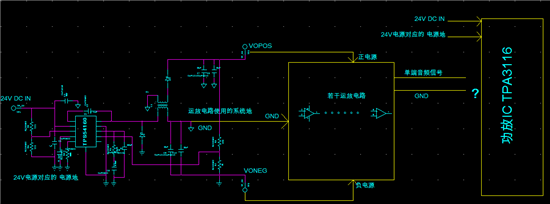 我现在是这样设想的,前级用一个DCDC配合一个耦合电感,实现正负电源供运放使用,但此时前级的地和后级的TPA3116这个功放的地电压不一样了,系统只有一个24V直流电源,前级的地从数据手册上看比后级的地高5V了,那这样的话,音频单端信号加隔直电容能行吗?前级的地也加一个隔直电容后到功放的输入?