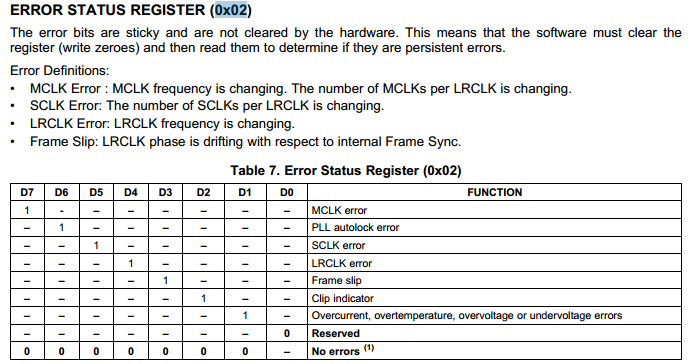 我发现的报PLL错误时,输出没有关断,还是有声音,只是有时会报这个错误,而声音调大时,输出关断报的错误是clip indicator错误,芯片手册上没有