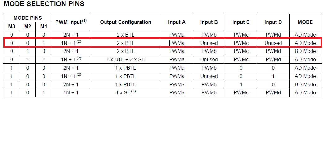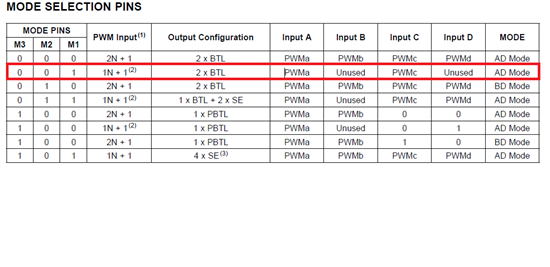 再来看M3M2M1=000或者M3M2M1=010,都是2N+1,BTL的两端分别是PWMa/PWMb;PWMc/PWMd。这样TAS5538设置是AD,TAS5612输出就是AD;TAS5538设置是BD,TAS5612输出就是BD。