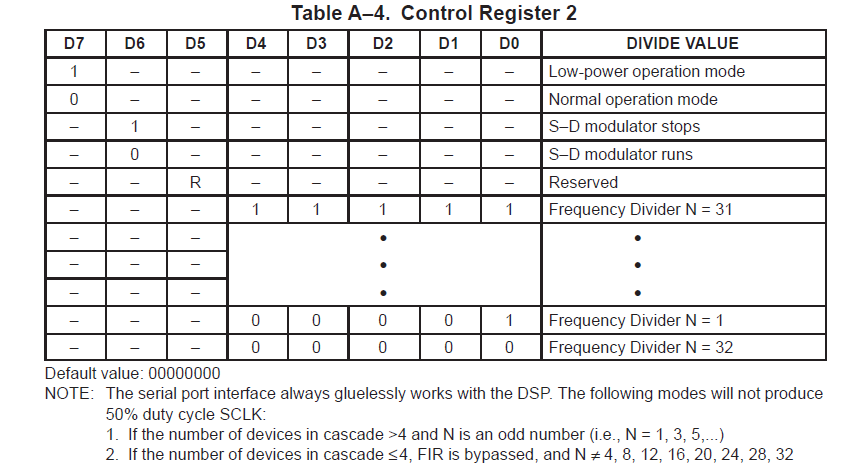 现在使用DSP通过Mcbsp对AIC10进行配置,在配置寄存器2的时候,通过改变N值来改变FS的频率时发现,N只能取偶数,不能取奇数,请问这是为什么,下图是寄存器和两个注意事项,可是没说在小于4个设备时候,N不能是奇数呀。还是我理解英语理解的有错误