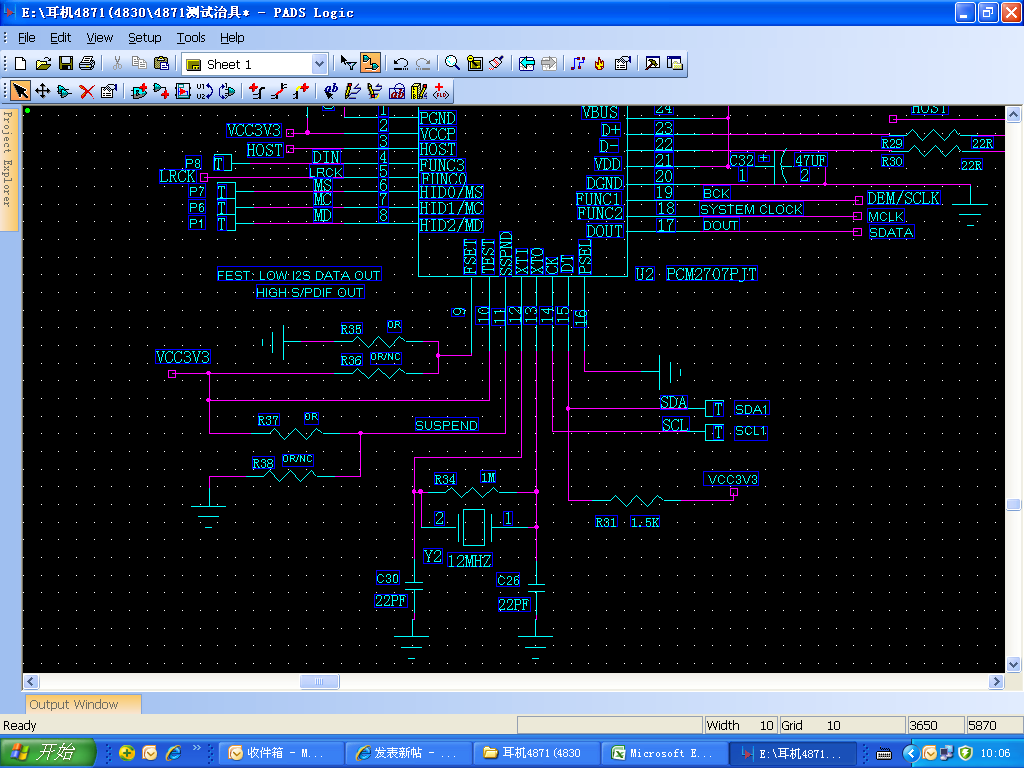 再上电,发现电流正常10mA,设备管理显示“USB音频驱动”,电脑似已识别,在芯片模拟输出端接上耳机,听没声音,再接