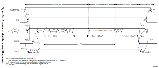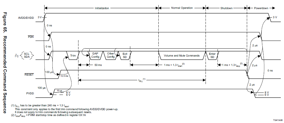 • Ramp up PVDD to at least 8 V while ensuring that it remains below 6 V for at least 100 µs after AVDD/DVDD reaches 3 V. Then wait at least another 10 µs.
