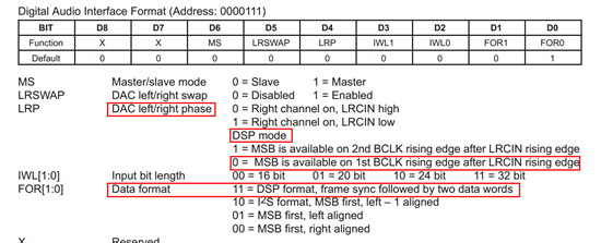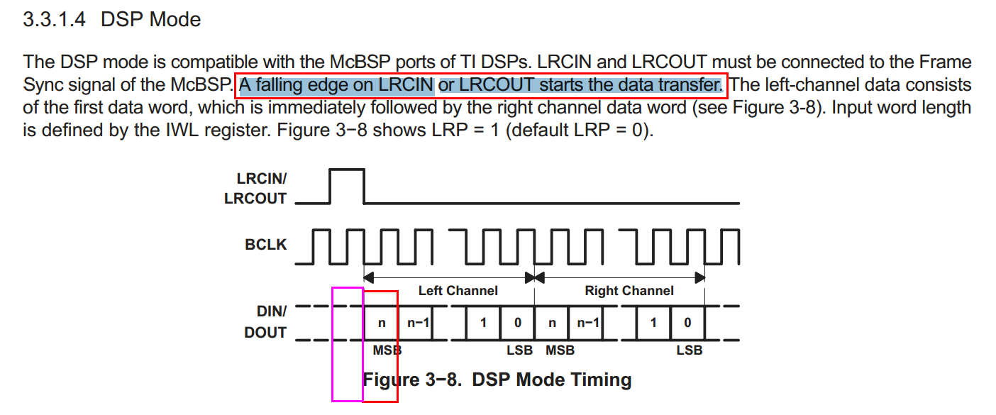 以下是TLV芯片上面基于DSP模式,数据读取的时序图,TLV的配置已检查,都是按照这个时序配置的。主要的几个配置如下注释
