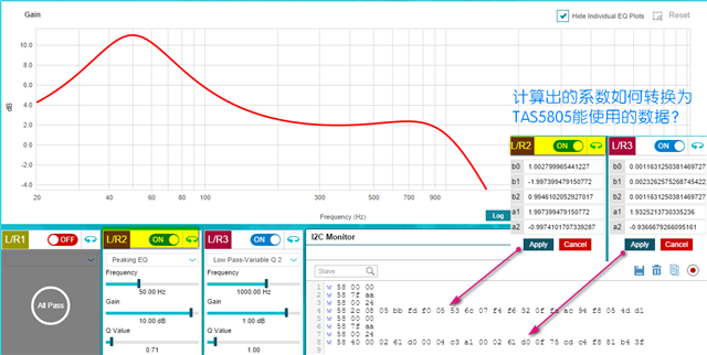 现在我可以根据一些数据来计算出系数,计算出的系数与PPC3的一样,但是不知道对应的转换公式,不知道计算出的浮点数据是如何转换tas5805可以使用的数据的?