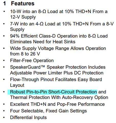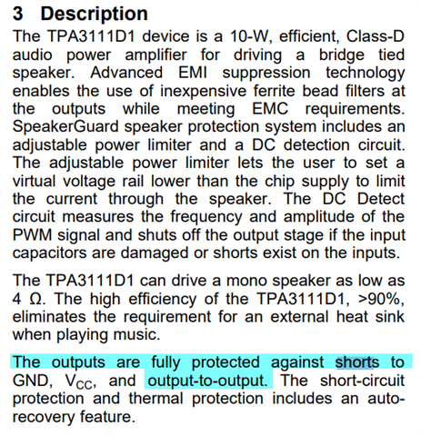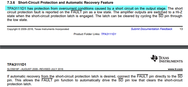 您的意思是说电路图中AO_P和AO_N短接后或P3的1脚和2脚短接后,TPA3111D1并没有进入保护状态,FAULT还是高电平?那可能是没有达到短路阻抗阈值,估计这个阈值比较低,因为在datasheet 第一页features部分说是pin to pin 短路。
