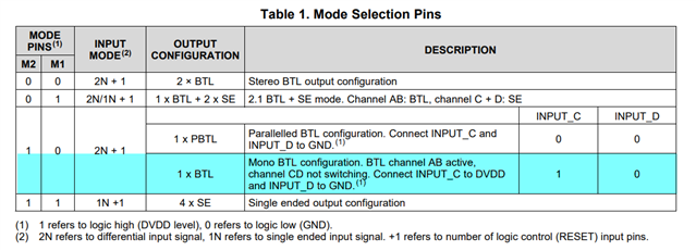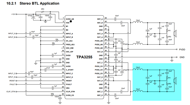 TPA3255   只用其中一半做BTL功放,A/B输入,A/B输出。请问  C/D 输入端和C/D 输出端如何处理。  还有,22、23、24、25、26、27、28、29、30、31(所有仅涉及C/D输入输出的引脚)如何处理,对于芯片比较安全。