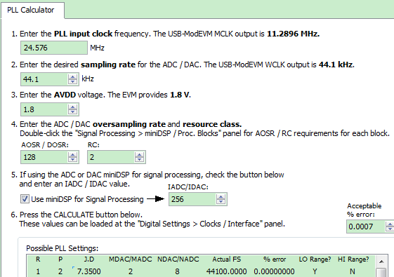 我的硬件是将AIC3254与DM8168的McASP[0]想连接。3254的MCLK由外部晶振提供,频率为24.576KHz。设置采样率为44.1KHz。计算时钟见下图。