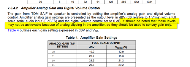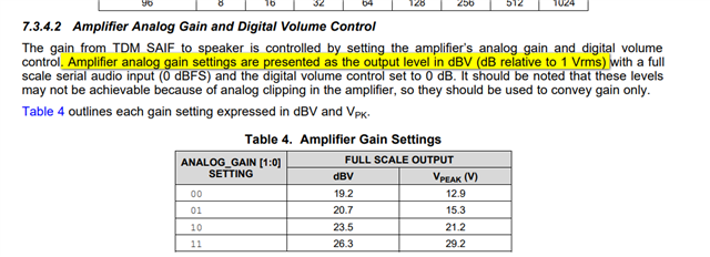 1. 按照datasheet中的描述,dBV是dB相对于1Vrms:gain=19.2dB=20log(Vout/Vin)。 因此按照这个公式计算下来Vout/Vin=9.120101. 但这个是平均值,需要换成peak值,即再乘以1.414. 得到9.120101*1.414=12.896V即为12.9V。