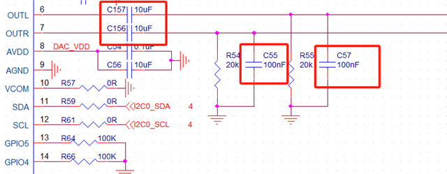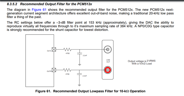 我不知道您这里100nF的C55的作用,如果想构成滤波器也应该是下面的参考电路,根据截止频率计算RC的值。您这个输出电路是参考的哪里的?