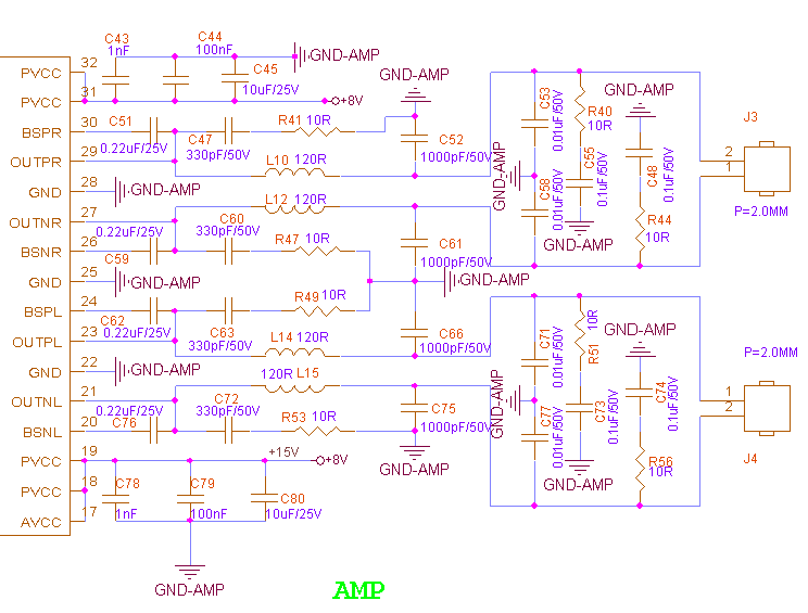 如题,我在使用TPA3130时。输出的10欧的电阻发热很历害,很烫手!!电路和PCB布局如下;请各位指导一下