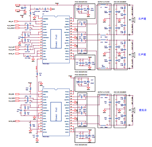 按照datasheet的解法实现2.1声道,一片做左右声道,另一片做重低音,如下图:
