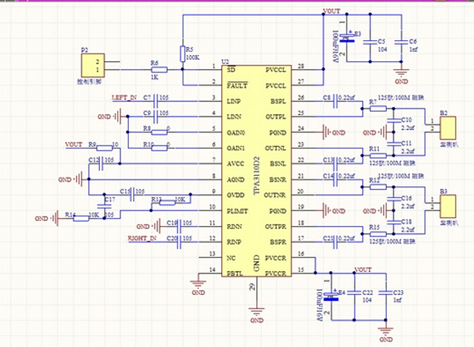 你的,我的供电电压是15V左右,是用TPS61175将5V电源升压至15V,我也试过用直流电源15V给功放供电,测试结果是如果用直流电源或者5V电源缓慢升高电压,功放有输出的时间会稍微长一些,大概十几秒,如果直接就是15V或者5V升压,几秒钟输出就没了,喇叭是4欧姆5W的,输出采用磁珠时会有输出但是声音很小也很杂,采用电感时声音正常,就是几秒钟就没了输出,上次没弄好,就一直没弄做其他事了,麻烦各位前辈给看看,本人之前没做过功放,所有东西都是按照资料上提供的电路做的,看看怎么回事,谢谢