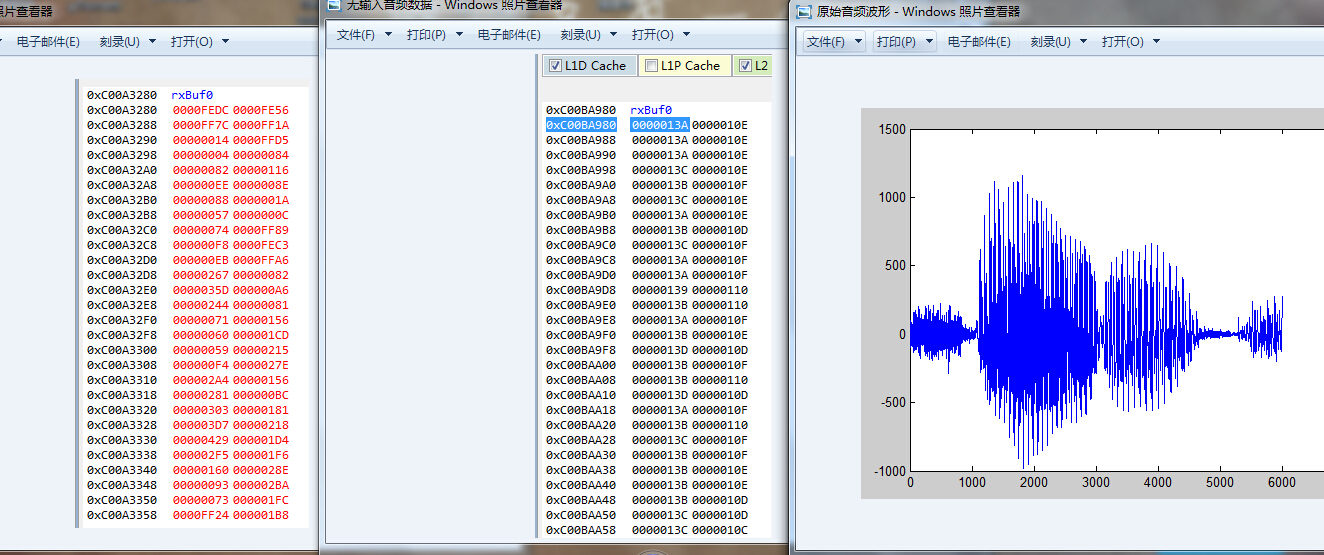 3、我使用line_in插进电脑,播放一段音频数据,然后读取AIC31采样后传输给dsp的数据,即例程中rxBufPtr数组中数据,始终不能得到和原始音频一样的波形(如附件三图),不知为什么,这个问题困扰我好久,请您帮忙看看。我看了aic31的文档,里面对它的编码原理没有介绍。