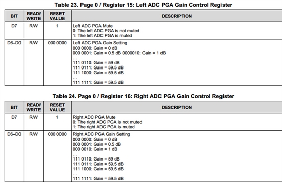 我在使用tlv320aic3106进行录音时,录得的声音较小,于是设置了这两个增益寄存器。