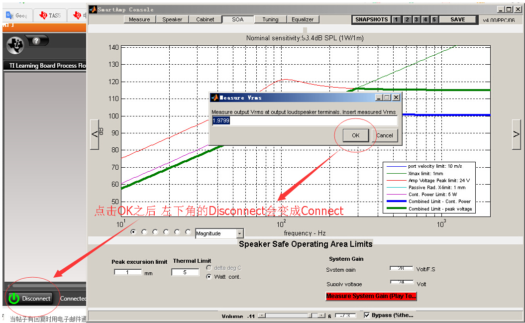 中 在SOA页下测量“Measure System Gain” 时 测试完之后软件就会从连接状态变为非连接状态。以及在Measure页下点击“Run& Fit All”也会有同样的断线,以及得不到喇叭的实时参数。