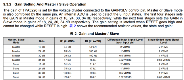 TPA3220 具有 单端或差分模拟输入接口,该接口最高 支持 2VRMS 的电压并具有四种可选增益:18dB、 24dB、30dB 和 34dB。详细请参考数据手册“9.3.2 Gain Setting And Master / Slave Operation”,www.ti.com.cn/.../tpa3220.pdf