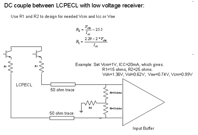 • 您好,我找了下没有相关文档来介绍LCPECL电平, 通过下面这个图可以看出,LCPECL是通过射极电阻组成的分压网络来设置DC耦合信号的共模电压。