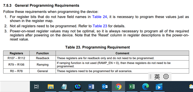 • 您好,感谢您的回复。是我提问时的措辞不够准确,我想请教的是7.5.1小节下的第四条:Program registers as shown in the register map in REVERSE order from highest to lowest。我已经使用ticspro来生成我需要的寄存器的值,也使用了evm板可以使用。并且在用ticspro控制evm板时也有初始化的一个步骤,但是那个步骤的寄存器值未知。我想询问的是,关于这边第四条提到的,初始化的时候,要先把133个寄存器全部配置,在初始化时的这133个寄存器的值该如何标定呢?感谢,期待您的回复。