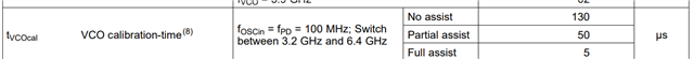 您好, partial assist应该是达不到20us时间 ,因为光VCO 校准时间就50us,参考下面表格可以看到full assist mode的VCO校准时间典型值为5us,而partial assist 的VCO校准时间为50us。