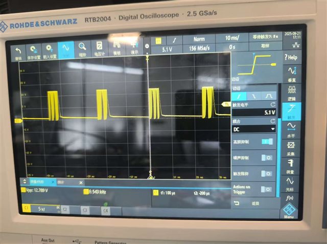 CSD95378B的最终输出,VSW端,应为0.9V,现在有个543KHz左右的波形串,拉开后波形串中有500kHz的方波(该方波与芯片的工作频率PWM频率相同)