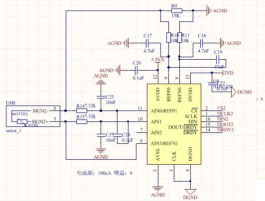 如上图所示,对照手册上典型应用,配置相应设置:gain:8;AINP为AIN1,AINN为AIN0;电流源为IDAC1,100uA,AIN3输出;参考电压设置为外部REFP0和REFN0;