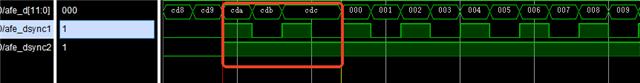 如图片中的数据,我的问题是正确的有效数据是从0开始的,而DSYNC1和DSYNC2提前数据导致前几个无效数据被接收,caa、cdb、cdc都是无效数据,在第三个DSYNC1的高电平才是有效数据