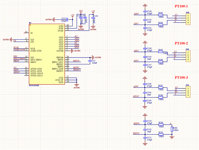 项目中使用ADS124S08芯片,采集3路四线PT100的温度,采用外部基准电压REFP1和REFN1;通过切换IDAC1恒流源采集3路PT100,现在遇到的问题是ADC采集的值不准,恒流源大小改变,ADC的值也会发生改变;电路原理图如下: