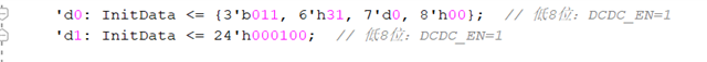 比如 DCDC_EN=1, 设置值(1st register's data) ):0000 0000 0000 0001b; 实际发送0000 0000 0000 0001 0000 0000b