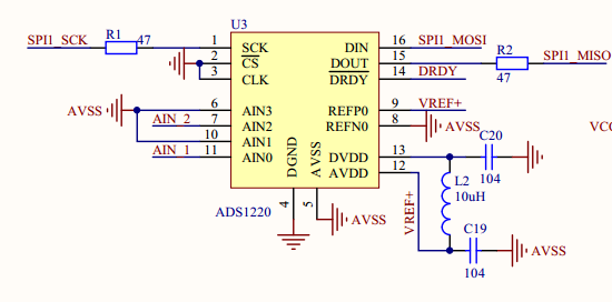 采用stm32驱动ads1220,ads1220连接图如图1所示,两个单端输入信号,ref+(3.298V)作为外部参考电压,但是使用采用了内部2.048V的参考电压,程序初始化时设置如下: