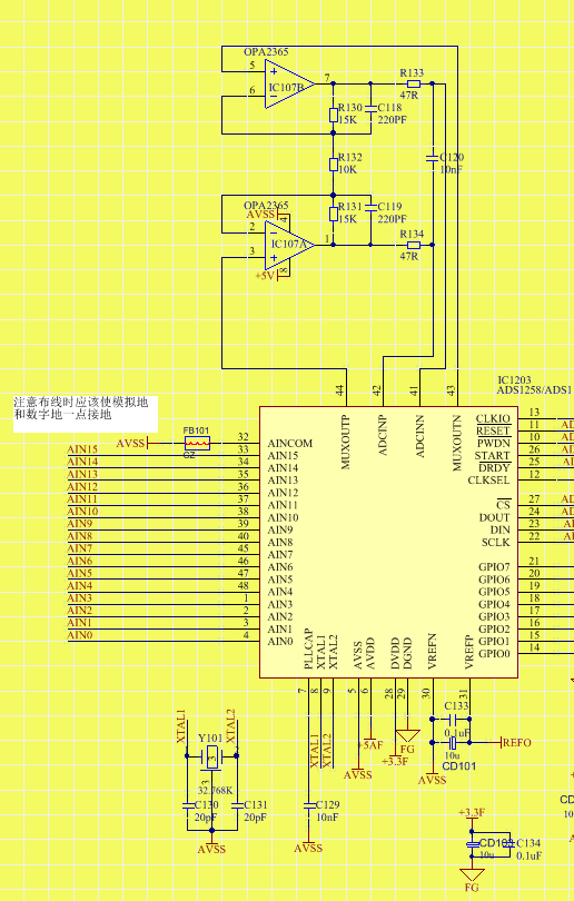 我使用ADS1258来测量心电信号,使用的是单电源+5V供电,利用右腿驱动电路把整个输入信号的中心电位固定到2.5V,参考ADS1258datasheet里面的Figure68的接法,输入信号从MUXOUTP,MUXOUTN输出接到OPA2365的两个运放组成的差动放大器,然后输入到ADCINP,ADCINN进行采集,目前遇到两个问题。