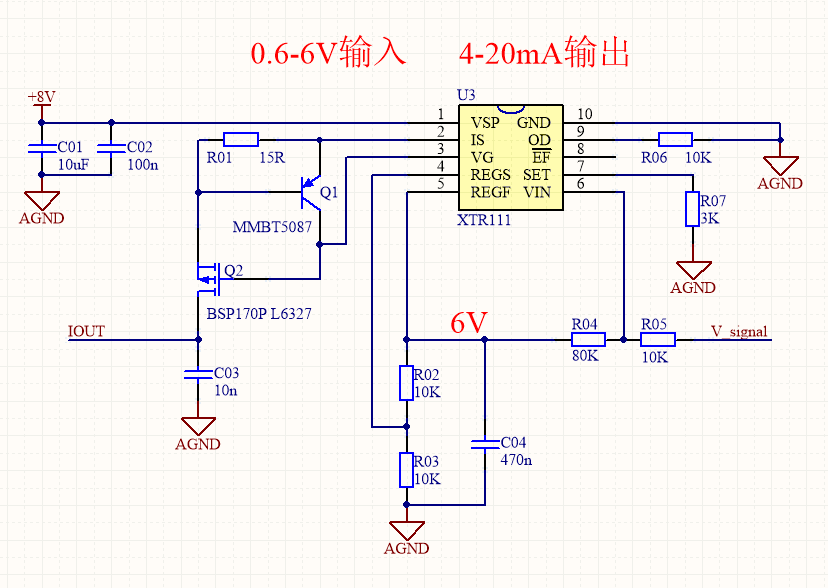附件是XTR111设计电路,传感器输出电压经过调理后对AGND是0.6-6V,我想要实现4-20mA电流输出,请问这种设计方法正确吗?谢谢!