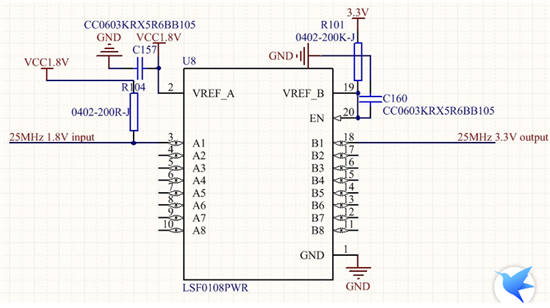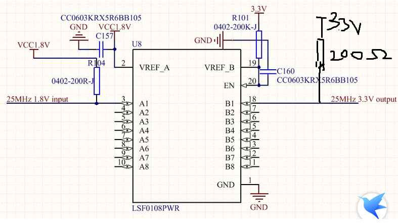 在VrefA是1.8V供电,上拉电阻100ohm,VreB是3.3V供电,上拉电阻200ohm,