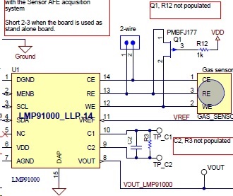 我现在在使用LMP91000连接gas sensor测量气体浓度,我看了下LMP91000EVM 评估板的电路设计: