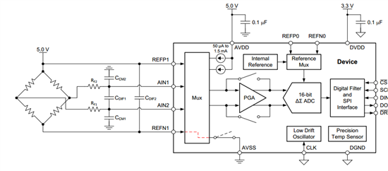 ADS1120+电阻桥的参考设计中,电阻桥的输入电源(5.0V)同时作为参考电源(接REFP1)使用,如下图: