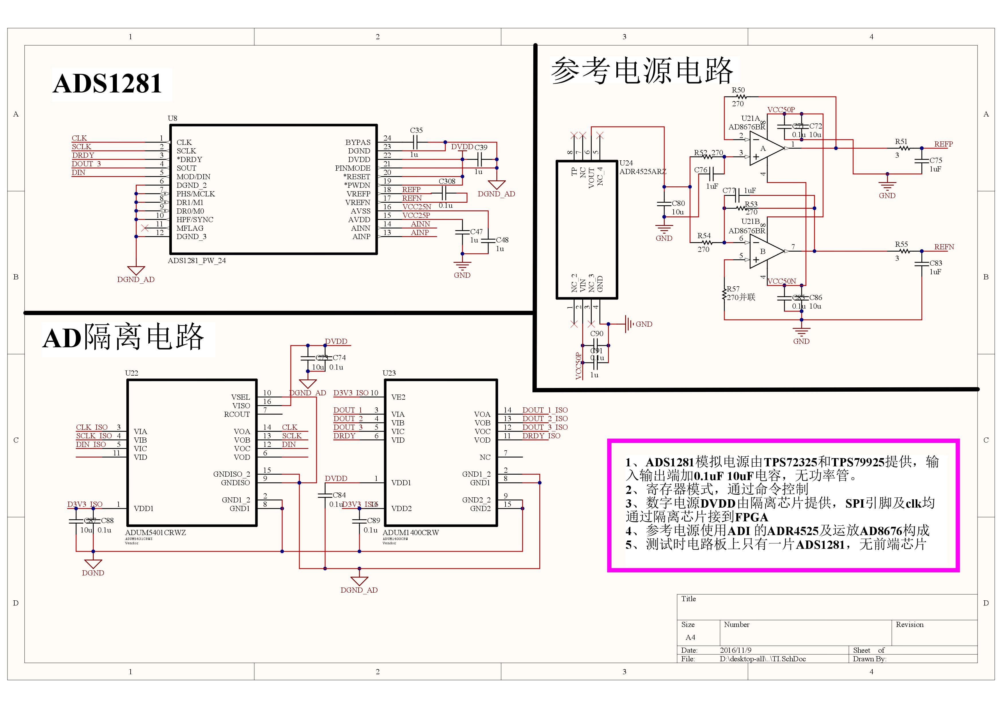 用ADS1281做3路同步数据采集   参考其他帖子及手册,将ADS1281的输入端短接测噪声,示波器观察输出数字信号有13位抖动,数据均值为4000多,按LSB计算噪声就达到了10uV,按照信噪比计算的理论噪声应该是10位,所以想知道我这边电路实测的噪声可能是哪里引入,ADS1281对PCB布局有没有什么特殊的要求。
